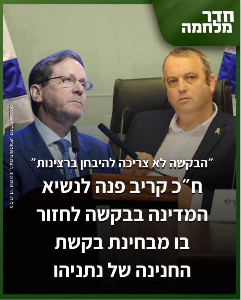 פניתי במכתב דחוף לנשיא המדינה מר יצחק הרצוג, בו קראתי לו לחזור בו מהודעתו על בחינת בקשת החנינה של נתניהו, ולהצהיר כי כל בקשת חנינה שאין בצדה לקיחת אחריות והתחייבות לסיום הפעילות הפוליטית אינה ראויה להישקל ברצינות ובכובד ראש.