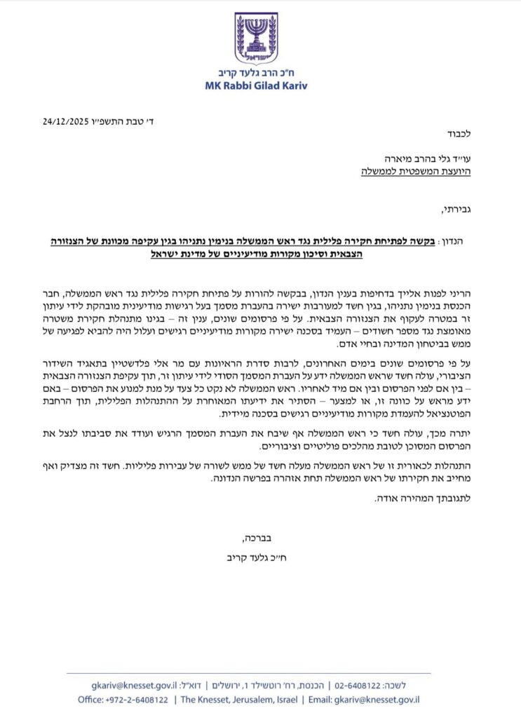פניתי כעת ליועצת המשפטית לממשלה בבקשה להורות על פתיחת חקירה פלילית נגד רה״מ נתניהו בפרשת המסמכים המסווגים.